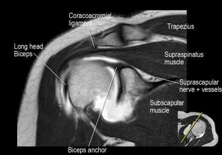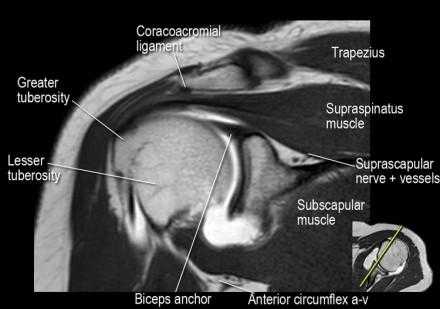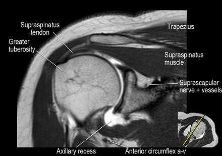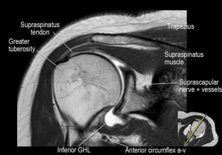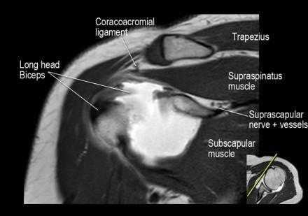 - обратите внимание на надлопаточный нерв и сосуды (suprascapular nerve and vessels)