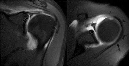 - поищите частичный разрыв сухожилия надостной мышцы в месте его прикрепления в виде кольцевидного повышения сигнала