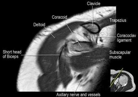 - обратите внимание на клюво-ключичную связку (coracoclavicular ligament) и короткую головку двуглавой мышцы (short head of the biceps).
