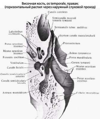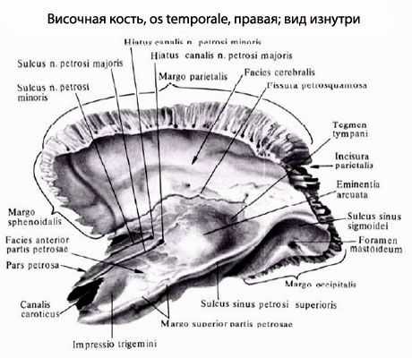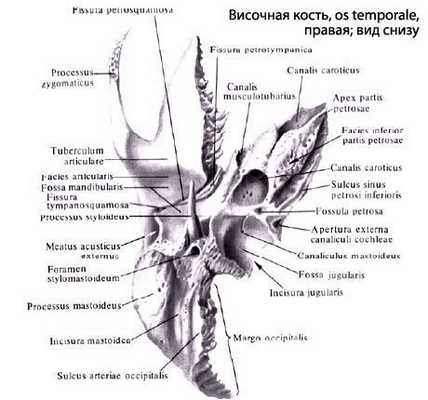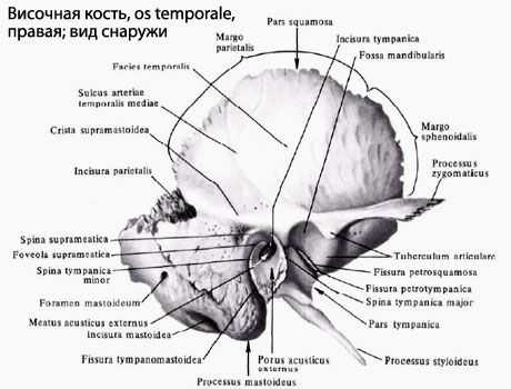 — Они расположены в области основания черепа и участвуют в образовании его боковой части. В височных костях находится орган слуха и равновесия. Кроме того, в костных каналах височных костей проходят такие важные нервные структуры, как лицевой и преддверно-улитковый нервы, находится узел тройничного нерва.