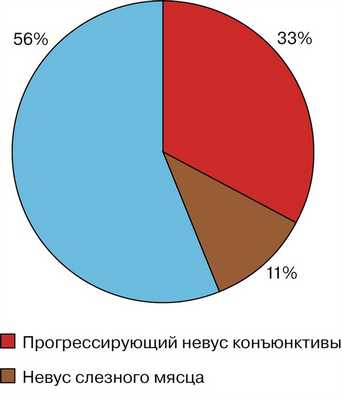 Из 48 больных 16 имели прогрессирующий невус конъюнктивы, 5 — невус слезного мясца, 27 — стационарный невус (рис. 1).