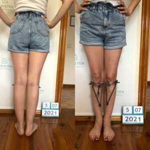 Достаточно грубая варусная деформация у девушки 25 лет исправленная при помощи метода Илизарова. У аппаратной методики есть важное преимущество, она позволяет производить коррекцию в любых плоскостях, одновременное увеличение длины, и одновременно проводить вмешательство на обеих нижних конечностях. Аппарат Илизарова можно спрятать под свободными брюками, и ходить без трости или костылей. Подобная операция не только является профилактикой развития в последующем гонартроза с поражением внутренних отделов коленных суставов, но так же значительно влияет на эстетику нижних конечностей, что крайне важно, когда мы говорим о девушках.