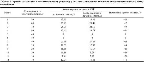 Динамика уровня антител к АХР представлена в табл. 2. Как видно из полученных результатов, у больных отмечались весьма незначительные и разнонаправленные изменения уровня аутоантител до и после введения иммуноглобулина.