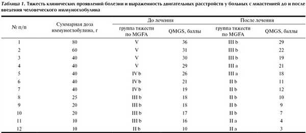 Сравнительный анализ изменений клинических показателей по QMGS и MGFA до и после введения иммуноглобулина представлен в табл. 1. Как видно из представленных данных, введение иммуноглобулина уменьшало тяжесть клинических проявлений миастении и двигательных расстройств у всех обследованных.