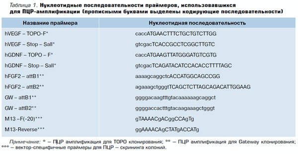 Первоначально в результате ПЦР-амплификации и на последующих этапах клонирования с помощью технологии BP-рекомбинации и ТОРО-клонирования были получены векторы-доноры: pDONR-FGF2, а также pENTR-GDNF, pENTR-VEGF121, pENTR-VEGF165, pENTR-VEGF189. Экспрессионные аденовирусные плазмиды pAd-FGF2, pAd-GDNF, pAd-VEGF121, pAdVEGF165, pAd-VEGF189, а также лентивирусные плазмиды pLX303-FGF2, pLX303-GFNF, pLX303-VEGF121, pLX303-VEGF165, pLX303-VEGF189 были получены с использованием LR-рекомбинации (Invitrogen). Наличие целевых фрагментов подтверждено данными рестрикционного анализа и автоматического секвенирования.