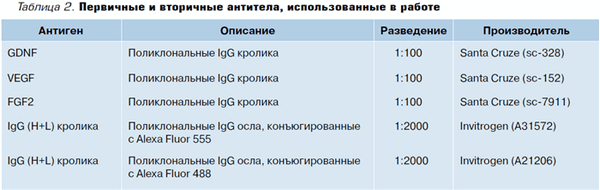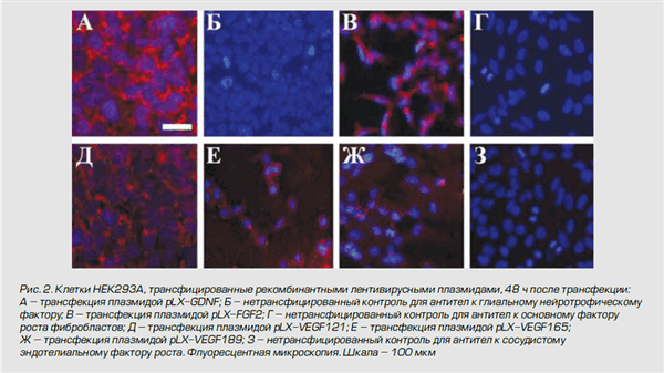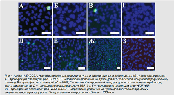 Генетическая модификация (трансфекция) клеток HEK293A рекомбинантными плазмидами. Клетки линии НЕК293А (Invitrogen, США) культивировали при 37°С во влажной атмосфере, содержащей 5% CO2, в среде Игла, модифицированной Дульбекко (DMEM), содержащей 10% сыворотку крови плодов коровы (FBS), 1% смеси антибиотиков пенициллина и стрептомицина и 2 мМ L-глутамина. Трансфекцию клеток линии НЕК293А с помощью полученных генетических конструкций (pAd-FGF2, pAd-GDNF, pAd-VEGF121, pAd-VEGF165, pAd-VEGF189; pLX-FGF2, pLX-VEGF121, pLX-VEGF121, pLX-VEGF165, pLX-VEGF189) проводили с помощью трансфекционного реагента TurboFect (Fermentas, Канада) согласно методике, рекомендованной производителем. Анализ экспрессии белков проводили через 48 ч после трансфекции с помощью иммунофлуоресцентного анализа.