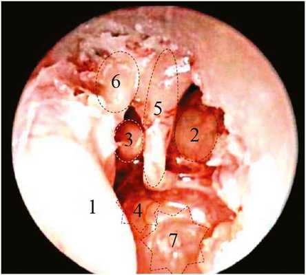 Рис. 3. Эндофотография (эндоскоп 45°) структур левого СУ (задний край annulustympanicus, барабанная струна и латеральная стенка аттика удалены). 1 — горизонтальный полукружный канал и область входа в антрум; 2 — тимпанальный сегмент ЛН; 3 — улитковыйотросток (processus cochleariformis) и сухожилие мышцы, напрягающей БП; 4 — промонториум; 5 — длинный отросток наковальни; 6 — стремя; 7 — сухожилие стременной мышцы.