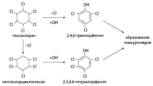 Метаболизм гексахлорана в организме проходит по пути дехлорирования, гидрокси- лирования и образования глюкуронидов во второй фазе метаболизма.