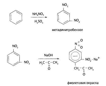 При дехлорировании ГХЦГ образуется бензол или хлорбензол, которые при взаимодействии с серной кислотой и нитратом натрия превращаются в п-нитро- или м-динитропроизводные, Нитропроизводные с ацетоном и гидроксидом калия образуют окрашенные соединения состава: