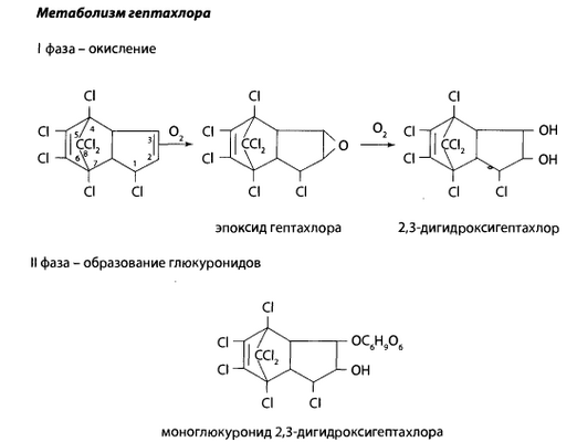 В организме гептахлор окисляется до эпоксигептахлора, который отличается более высокой токсичностью, чем сам гептахлор. Гептахлор и эпоксигептахлор накапливаются в тканях организма и оказывают токсическое действие. В почве продукты метаболизма гептахлора сохраняются в течение нескольких лет.