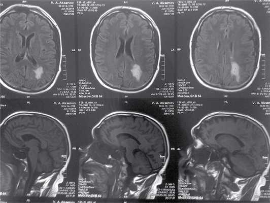 Магнитно-резонансная томограмма пациента А. Ишемический инфаркт в теменно-затылочной области левого полушария головного мозга.