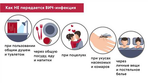 ВИЧ НЕ передается: через общую посуду, еду и напитки, при укусах насекомых и комаров, при поцелуях, через личные вещи и постельное белье, при пользовании общим душем и туалетом (рис. 1).