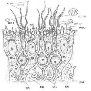 ОБ - обонятельная булава; ОК - опорная клетка; ЦО - центральные отростки обонятельных клеток; БК - базальная клетка; БМ - базальная мембрана; ВЛ - обонятельные волоски; МВР - микроворсинки обонятельных и МВО - микроворсинки опорных клеток.