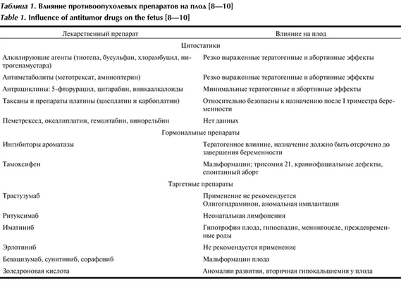 Согласно классификации FDA, все лекарственные средства, применяемые во время беременности, разделяются по категориям их безопасности. Химиотерапевтические препараты отнесены к категории X, т. е. противопоказаны в связи с эмбрио- и тератогенным воздействием. Накопленный опыт свидетельствует о том, что использование данных препаратов возможно после завершения периода эмбриогенеза. Наиболее уязвимым является интервал с 5-й по 10-ю неделю, в период эмбриогенеза, когда применение антиметаболитов и алкилирующих агентов приводит к грубым порокам развития в 16% наблюдений. Введение одного цитостатика в I триместре повышает риск развития пороков до 10%, а нескольких — до 25% [4]. После 12 нед проведения химиотерапии не повышается риск возникновения пороков развития у плода, но ассоциировано с акушерскими осложнениями (задержка роста плода, преждевременные роды, анте- и интранатальная гибель плода, подавление гемопоэтических клеток) в 27% [4—6] (табл. 1). Таблица 1. Влияние противоопухолевых препаратов на плод [8—10]