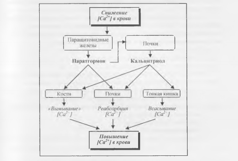 Важнейшую роль в регуляции содержания Са2+ в крови играет паратгормон. Он повышает уровень Са2+ в крови в результате воздействия на кишечник, кости и почки. Паратгормон повышает скорость растворения кости, т.е. вымывание из нее как органических так и неорганических компонентов, что обеспечивает переход кальция во внеклеточную жидкость и его поступление в кровь. Паратгормон снижает выведение кальция с мочой, стимулируя его реабсорбцию, причем под влиянием паратгормона уровень реабсорбции Са2+ из первичной мочи может достигать 98 и более процентов. Паратгормон стимулирует также образование в почках 1,25дигидроксихолекальциферола, косвенным образом через наработку этого производного витамина Д увеличивая эффективность всасывания кальция в кишечнике.