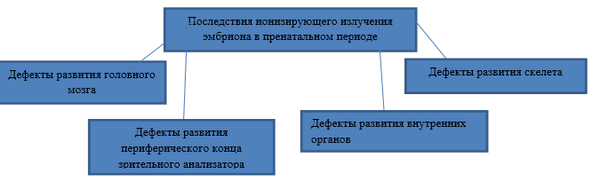Организм эмбриона и плода обладает крайне высокой радиочувствительностью. Облучение в этот период в незначительных дозах вызывает тератогенные эффекты в виде различных пороков развития.