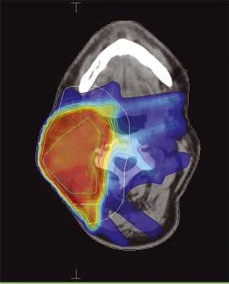 Рис. 2. Дозное распределение при повторном облучении очага в носоглотке методикой IMRT. Градиентом цвета обозначен переход от максимальной дозы (красное) к минимальной (синий цвет, 10% от максимальной). Покрытие мишени (PTV) не менее 95%.