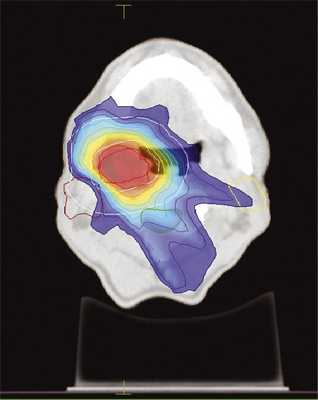 Рис. 1. Дозное распределение при повторном облучении очага в носоглотке методикой IMRT. Градиентом цвета обозначен переход от максимальной дозы (красное) к минимальной (синий цвет, 10% от максимальной). Покрытие мишени (PTV) не менее 95%.