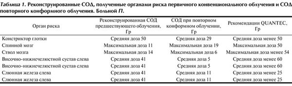 Больной П., 1977 года рождения, проходил лечение в клинике МРНЦ им. Цыба в мае 2010 г. с диагнозом: плоскоклеточный рак полости носа cT1N0M0. Проведено комбинированное лечение: одновременная химиолучевая терапия в режиме гиперфракционирования с неравномерным дроблением дневной дозы (1 Гр + 1,5 Гр). После этапной оценки степени регрессии опухоли на суммарной очаговой дозе (СОД) 50 Гр в связи с регрессией менее 50% проведено оперативное вмешательство в объеме резекции остаточной опухоли полости носа. Больной регулярно наблюдался в течение 4 лет. В мае 2014 г. у пациента диагностирован рецидив опухоли, по поводу чего проведено повторное конформное облучение на фоне полихимиотерапии с использованием препаратов платины и таксотера. Область носоглотки является одной из наиболее сложных при планировании лучевой терапии, особенно с учетом сложности оценки реально полученной лучевой нагрузки на органы риска (спинной мозг, головной мозг, височно-нижнечелюстные суставы, большие слюнные железы и верхний констриктор глотки) при предшествующем конвенциональном облучении (облучение прямоугольными полями, двухмерное планирование, отсутствие фиксации больного). Поэтому для оценки первичной лучевой нагрузки была проведена реконструкция полей облучения в системе объемного планирования, что позволило нам убедиться в том, что полученная органами риска лучевая нагрузка не превышала толерантные дозы (табл. 1).