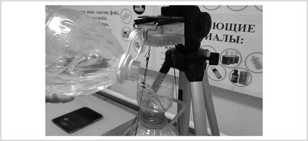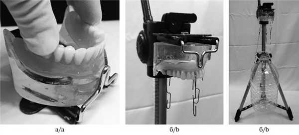 После этого изучали силу адгезии. Модель с протезом жестко фиксировали в штативе протезом вниз. К последнему через заранее подготовленные под искусственными зубами отверстиями прикрепляли 5-литровую емкость (рис. 4). Рис. 4. Этапы эксперимента. а, б — фиксация модели в штативе; в — емкость для воды закреплена под протезом.