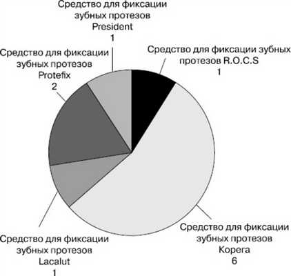 На рис. 5 представлена частота использования пациентами разных кремов для фиксации зубных протезов. Отметим, что выбор пациентами крема для фиксации зубного протеза осуществлялся согласно рекомендациям работника аптеки. Следует также подчеркнуть, что среди этих лиц у 3 человек (25%) фиксация съемных зубных протезов была неудовлетворительной, что связано с переломом кламмеров частичного съемного протеза (1 случай) и выраженным несоответствием базисов полных протезов тканям протезного ложа (2 случая) из-за выраженной атрофии альвеолярных отростков (частей) челюстей и частых реставраций зубных протезов (р≤0,05).