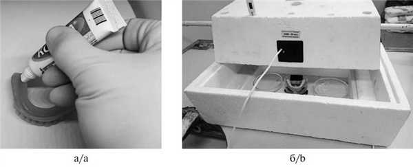 Затем образцы извлекали, заполняли протезное пространство кремом, излишки удаляли и помещали модель в водяную баню еще на 5 мин (рис. 3). Рис. 3. Этапы эксперимента. а — нанесение фиксирующего крема на протезное ложе; б — модель с протезом помещена в водяную баню.