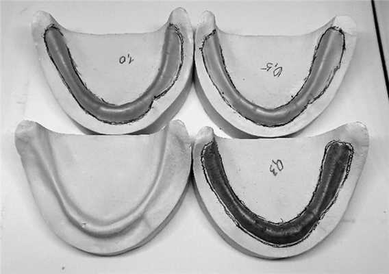 Для исследования была изготовлена акриловая мастер-модель беззубой нижней челюсти из прозрачной пластмассы. Для создания различного зазора между базисом полного съемного протеза и поверхностью модели были изготовлены четыре гипсовые модели, являющиеся точными копиями акриловой модели. На них были определены одинаковые границы базисов полных съемных протезов и при помощи бюгельного воска различной толщины (0,3, 0,5 и 1 мм) на трех из них создана изоляция по всему периметру протезного ложа, не доходя 0,5 мм до границы базиса протеза; на одну из моделей изоляцию не наносили (рис. 1). Рис. 1. Рабочие модели из супергипса с восковой изоляцией протезного ложа толщиной 0,3, 0,5 и 1 1 мм и без изоляции.