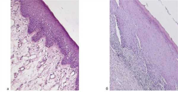 Рис. 2. Пациент К., 62 года (контрольная группа исследования), впервые протезируемый съемными зубными протезами. а — морфологическая картина слизистой оболочки в области будущего протезного ложа (норма), (гематоксилин-эозин, ув. 100); б — морфологическая картина слизистой оболочки в области протезного ложа на 29-е сутки адаптационного периода, в соединительной ткани слизистой выявляется умеренно выраженная мононуклеарная и слабовыраженная нейтрофильная воспалительная реакция; гиперкератоз и акантоз многослойного плоского эпителия слизистой (гематоксилин-эозин, ув. 100).