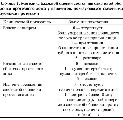 Таблица 1. Методика балльной оценки состояния слизистой оболочки протезного ложа у пациентов, пользующихся съемными зубными протезами