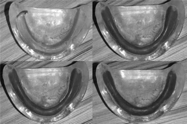 Полученные модели дублировали технической силиконовой массой для изготовления 4 моделей из супергипса, на которых проводилось изготовление полных съемных протезов. В результате нами было получено 4 полных съемных нижних протеза с одинаковыми границами, но разной величиной зазора от протезного ложа.