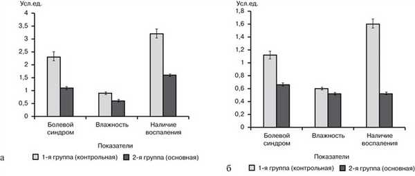 Рис. 2. Оценка реакции слизистой оболочки протезного ложа у пациентов контрольной и основной групп. а — на 3—4-е сутки адаптационного периода; б — на 28—30-е сутки адаптационного периода.