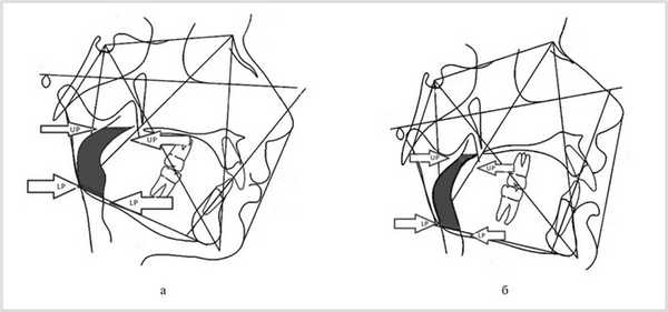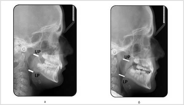 Рис. 3. Пациентка К., 9 лет; история болезни № 0047118; нижняя ретрогнатия; дистальная окклюзия; глубокая резцовая окклюзия. Скученность зубов; ТРГ в боковой проекции. Величина верхнего (UP) и нижнего (LP) фарингеального пространства. а — до ортодонтического лечения: UP и LP; б — после лечения: UP и LP.