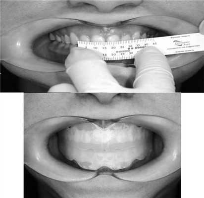 При применении Корректора определяется только размер, так как эластопозиционер моделирует оптимальную окклюзию без увеличения разобщения зубных рядов по оклюзионной плоскости в разных участках. Эластичная каппа для коррекции прикуса Корректор выпускается 8 типоразмеров. Каждый типоразмер соответствует длине 4 резцов, измеренной по экватору вестибулярной поверхности ВЧ и НЧ (рис. 1). Рис. 1. Подбор Корректора (а); в полости рта (б).