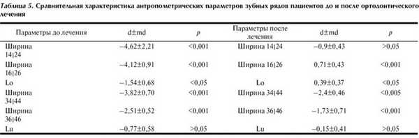 Согласно результатам исследования диагностических моделей зубных рядов пациентов после ортодонтического лечения, сагиттальные размеры зубных рядов ВЧ и НЧ приблизились к нормальным значениям: средняя длина передних отрезков ВЧ и НЧ по Коркхаузу соответственно 18,2±0,22 и 16,5±0,55 (табл. 5).