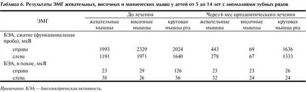 Результаты ЭМГ жевательных, височных и мимических мышц у детей от 5 до 14 лет с аномалиями зубных рядов приведены в табл. 6.