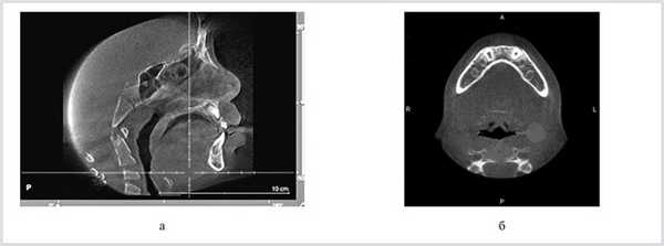 Рис. 2. КЛКТ. Результатуты конусно-лицевой компьютерной томографии. а — срединно-сагиттальный верхний и нижний ротоглоточные размеры; б — аксиальный срез, определение переднезаднего и трансверсального размеров ротоглотки.