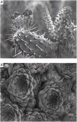 Рис. 13.12. А. У кактуса Opuntia толстые мясистые стебли служат для запасания воды. Поскольку листьев у опунции нет, интенсивность транспирации сильно снижается, а иглы защищают растение от травоядных животных. Б. Молодило, или живучка (Sempervivum), — типичный суккулент, запасающий воду в мясистых листьях.