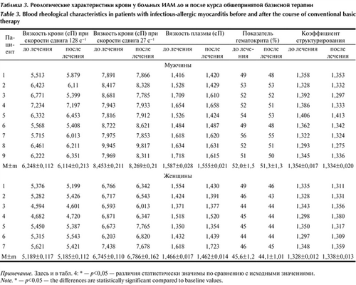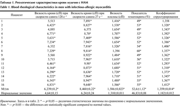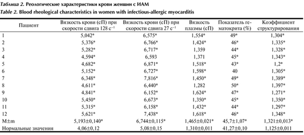 Как мы видим из табл. 1, вязкость Таблица 1. Реологические характеристики крови мужчин с ИАМ Примечание. Здесь и в табл. 2: * — р