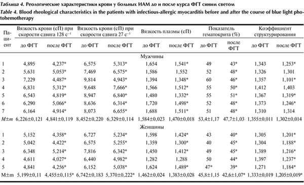 Иная картина наблюдалась в группе больных, получавших базисную терапию в сочетании с воздействием синего света на кровь. Метод ФГТ с применением синего диапазона излучения был использован у 12 больных ИАМ (табл. 4). Таблица 4. Реологические характеристики крови у больных ИАМ до и после курса ФГТ синим светом