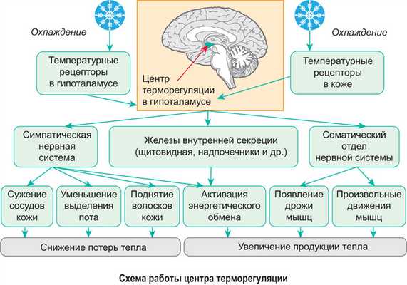 В процессе терморегуляции задействованы нервные и гуморальные (происходящие в жидких средах тела - крови, лимфе и т. д.) механизмы 2 . Колебания температуры окружающей среды распознают специальные терморецепторы 4 . Их существует два вида: тепловые и холодовые 4 . От терморецепторов сигнал по проводящим путям поступает в головной мозг и активирует в нем центр температурной регуляции, находящийся в области гипоталамуса 1,5 . Возбуждение разных отделов этого структурного образования приводит к изменению процессов теплообмена 1,5 . Центр терморегуляции в мозге можно «выключить» при помощи некоторых физических веществ. В этом случае тело человека утратит способность поддерживать постоянную температуру 1 .