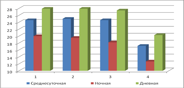Рис. 2. Динамика среднемесячной температуры в июне-сентябре в разное время суток. Примечание: 1- июнь; 2 - июль; 3 - август; 4 - сентябрь (2012)