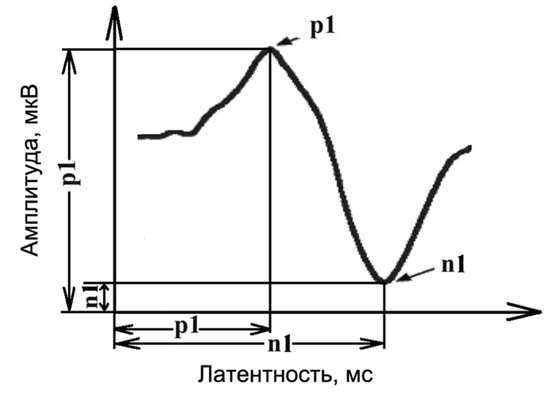 В первых работах по изучению ВВМП временной интервал пиков P и N был получен на 13 и 23-й мс соответственно. Поэтому некоторые авторы используют обозначения P13, N23, хотя это не всегда соответствует полученным данным, а ряд других исследователей более предпочтительным считают обозначения P1 и N1 [1, 4, 9, 23, 35]. Латентность ВВМП оценивается по латентности P1 и N1 и временному интервалу P1N1. Время задержки, связанное с прохождением импульса по дуге ВЦР, лежащего в основе ВВМП, рассматривается как латентность P1 [13]. В ряде случаев у здоровых людей встречается задержка проведения импульса на уровне ствола мозга, не превышающая 1 мс, которая графически отображается небольшим пологим зубцом на кривой, соединяющей компоненты P1 и N1. Время проведения возбуждения к ГКСМ составляет около 5,2 мс. У отдельных субъектов латентность P1 составляет до 8 мс. В этих условиях время центрального проведения составляет около 1,8 мс, что соответствует, по меньшей мере, двум синаптическим задержкам: на уровне вестибулярных ядер и двигательного ядра ГКСМ. Если задержка на синапсе составляет 0,6 мс, то центральный путь не может включать более двух синапсов, а задержка проведения по дуге ВЦР - около 0,5 с. Латентность N1 является результатом процессов ингибирования [13].