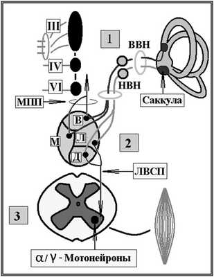 Большая часть данных о проводящих путях саккулоцервикальной рефлекторной дуги получена в ходе исследований на животных. Эти данные предполагают, что и у людей за ответ ВВМП ответствен такой же проводящий путь [23]. Основной проводящий путь ВВМП начинается в макуле круглого мешочка, затем последовательно проводится по нейронам вестибулярного ганглия Скарпа, нижнего вестибулярного нерва, латерального вестибулярного ядра (ЛВЯ), медиального вестибулоспинального тракта (МВСТ), и заканчивается в мотонейронах некоторых сгибательных, разгибательных и вращающих мышц шеи. Круглый мешочек оказывает стимулирующее действие на ипси- и контралатеральные мышцы, разгибающие шею; ингибирующее действие - на ипси- и контралатеральные мышцы, сгибающие шею, и на ипсилатеральную грудиноключично-сосцевидную мышцу (ГКСМ), вращающую шею [45]. Основные проводящие пути реализации ВВМП представлены на рис. 1. Рисунок 1. Основные проводящие пути реализации ВВМП: 1- первый нейрон; 2 - второй нейрон; 3 - третий нейрон. МПП - медиальный продольный пучок; ЛВСП - латеральный вестибулоспинальный путь; ВВН - верхний вестибулярный нерв; НВН - нижний вестибулярный нерв; III - ядро III пары черепных нервов; IV - ядро IV пары черепных нервов; VI - ядро пары черепных нервов.