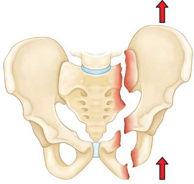 На рисунке — Вертикально-нестабильный перелом. При данном переломе одна половина таза смещается вверх