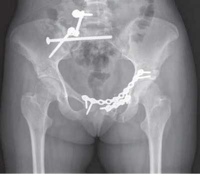 В данном случае для стабилизации перелома костей таза использованы пластины и винты.