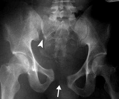 Рентгенограмма нестабильного повреждения таза с разрывом лонного симфиза (стрелка) и крестцово-подвздошного сочленения (треугольная стрелка).
