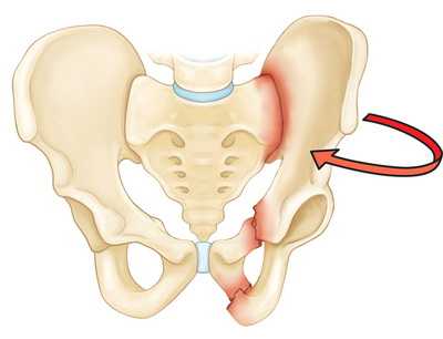 На рисунке — Перелом в результате боковой компрессии. При данном типе перелома одна половина таза ротируется внутрь.