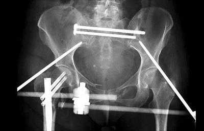 В данном случае для стабилизации костей таза использован наружный фиксатор.