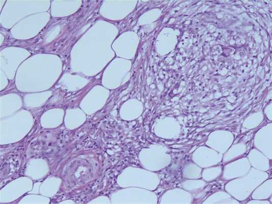 На втором этапе провели анализ изменений в подкожной клетчатке в зависимости от характера течения заболевания. Из 62 больных ИЛП (в том числе у 9 с острым, у 13 с подострым и у 40 с хроническим течением болезни) у половины пациентов каждой подгруппы отмечали липонекроз (см. рис. 3, а). Следует отметить, что при подостром и остром течении преобладал полиморфно-клеточный воспалительный инфильтрат: 10 (76,92%) из 13 случаев подострого ИЛП и 8 (88,89%) из 9 случаев острого ИПЛ (см. рис. 3, в). В инфильтрате больных с хроническим течением ИЛП преимущественно присутствовали лимфоциты — у 38 (95%) из 40. В инфильтрате больных этой группы гигантские многоядерные клетки выявлены в большом количестве. Встречали гранулемы в дольках клетчатки (рис. 4). Рис. 4. Подкожная клетчатка. Гранулема, гигантские клетки. Окраска гематоксилином и эозином, ×250. Эозинофилы в инфильтратах статистически значимо выявляли у больных с хроническим течением ИЛП (χ 2 =13,43; р=0,001). Описанные изменения сопровождались развитием продуктивных васкулитов у половины пациентов этой подгруппы (21, 52,5%) (χ 2 =6,90; р=0,03). Частота формирования гранулемоподобных структур значимо не различалась в целом и в подгруппах заболевания. Независимо от характера течения ИЛП фиброз соединительнотканных септ и сосудов отсутствовал (χ 2 =5,98; р=0,05).