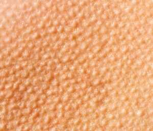 Фолликулярный гиперкератоз - дерматит, обусловленный чрезмерным разрастанием рогового слоя кожи, нарушением слущивания эпидермиса и закупоркой устьев фолликулов чешуйками эпидермиса. Фолликулярный гиперкератоз внешне выглядит как «гусиная» кожа, покрытая мелкими ярко-красными узелками, в области локтей, колен, ягодиц, внешней поверхности бедер. На ощупь кожа, пораженная фолликулярным гиперкератозом, становится шероховатой, сухой, грубой. Лечение осуществляет дерматологом; включает в себя местное применение стероидных средств, проведение химических пилингов (АНА, Джесснера, салицилового), прием витамина А, подбор кератолитических косметических средств для ухода за кожей.
